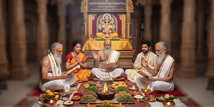 A sacred Dhantrayodashi ceremony focused on Lord Dhanwantari to seek health, wealth, and healing for your family, conducted with sacred mantras by highly skilled, knowledgeable, and Vedic scholars.