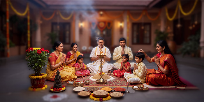 A full household spiritual ceremony consists of Yamadeep Daan, Tulsi pujan, and traditional evening rituals to eliminate negative impacts and seek auspicious results following centuries-old Vedic customs.